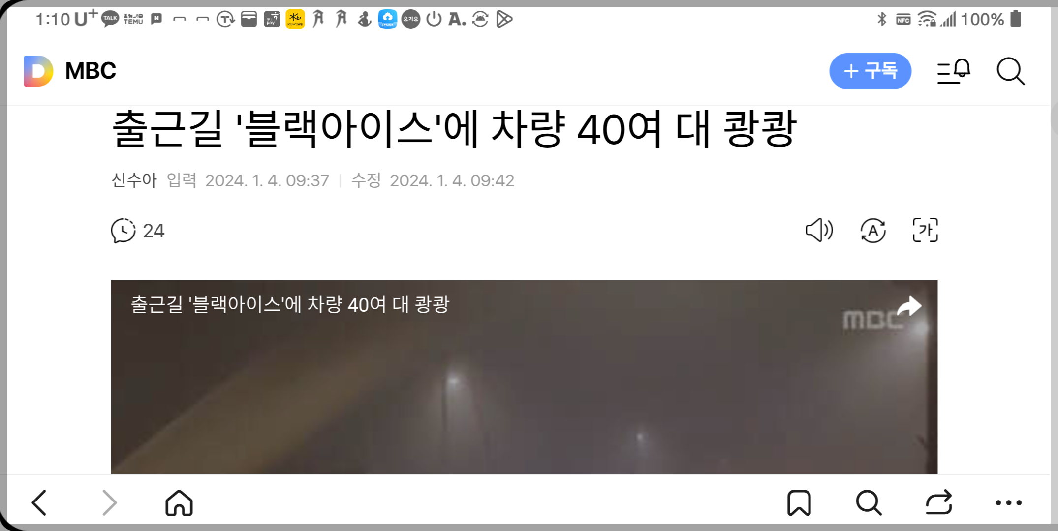 안녕하세요. 지난 4일 뉴스를 보니 블랙아이스로 인해 차량 40여 대가 사고가 났다는 기사를 읽었습니다. 새벽에 기온이 급격히 떨어지면서 교량 위 도로에 블랙아이스로 인해 약 40대가 연달아 추돌했고 블랙아이스에 안개까지 끼면서 사고가 컸다는 내용이었습니다.