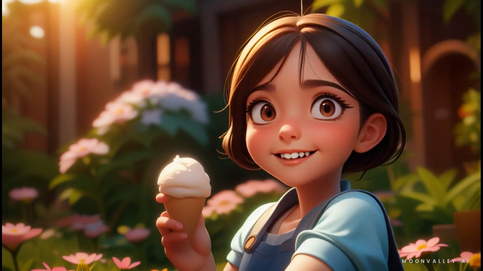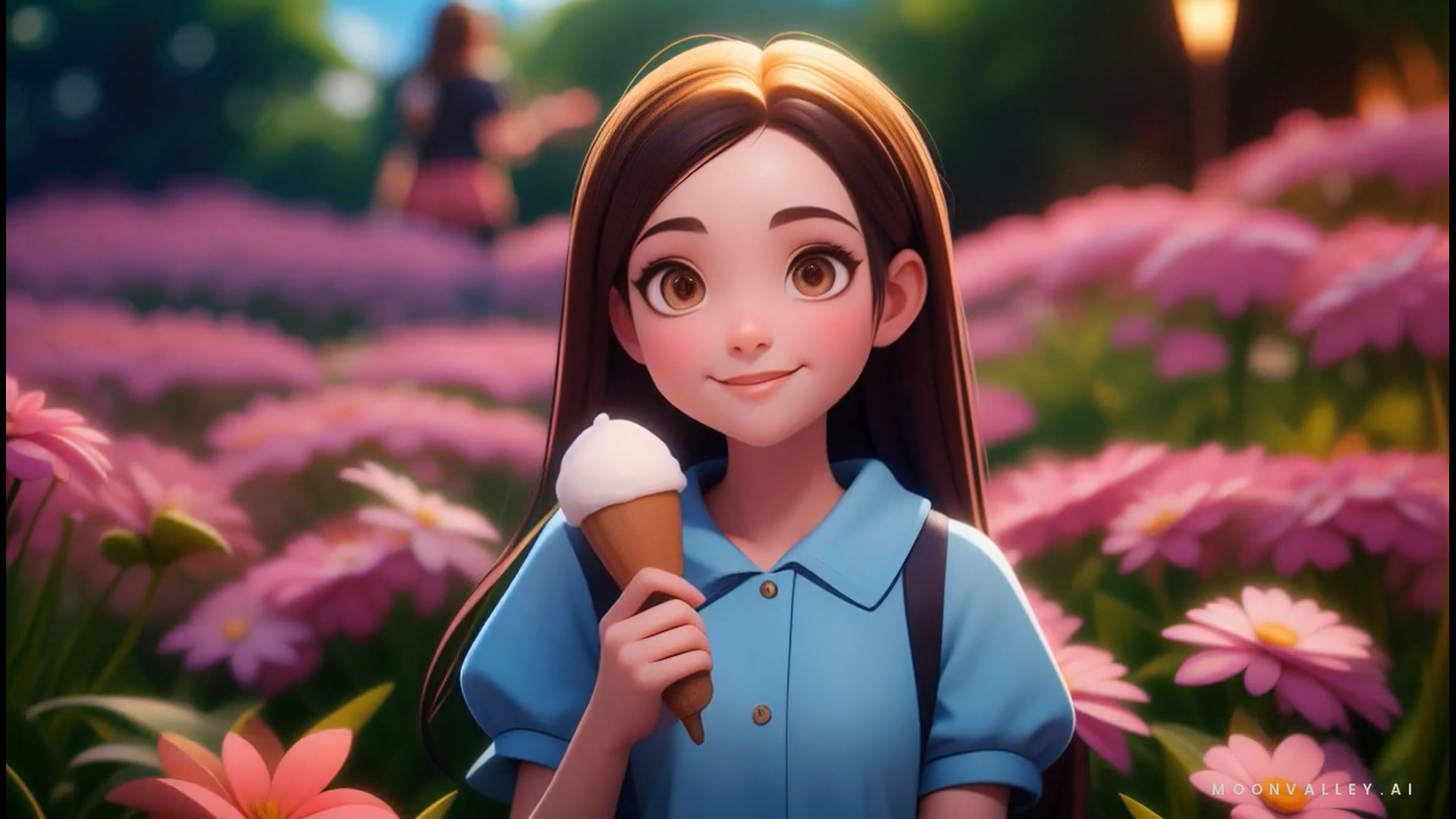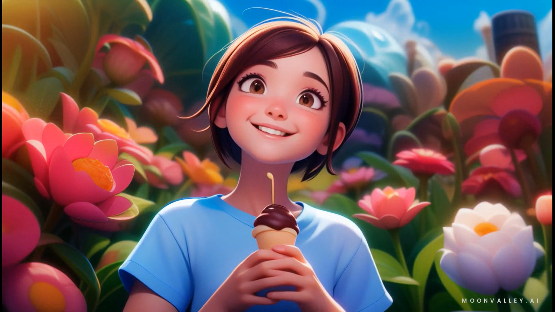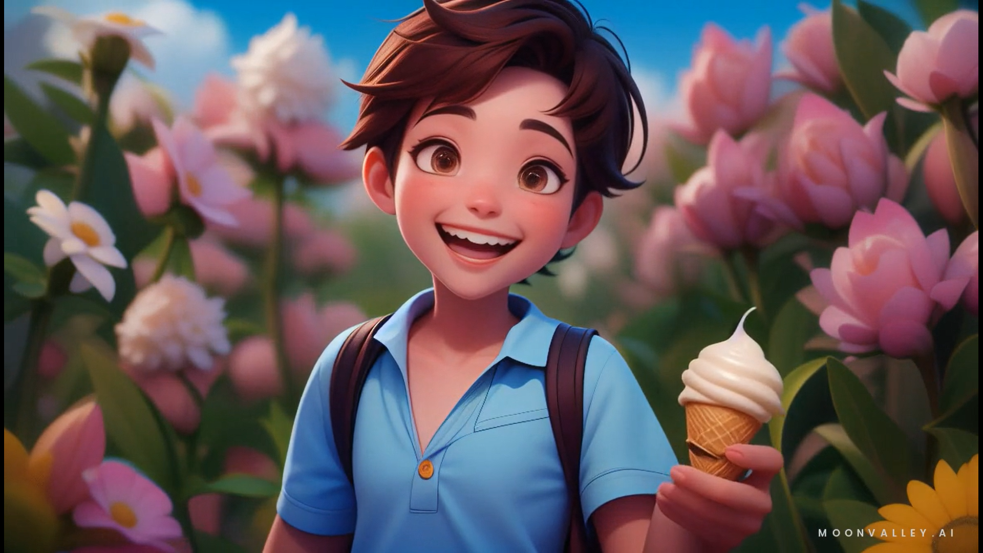 공원은 화사한 꽃들로 가득 차 있었다. 햇볕이 따사로운 날이었고, 공기는 달콤한 향기로 가득했다. 나는 내 아이스크림으로 행복했다. 나는 푸른 잔디 위에 앉아 작은 탐험가처럼 느껴졌다, 마치 사탕 세계에 들어온 것처럼.