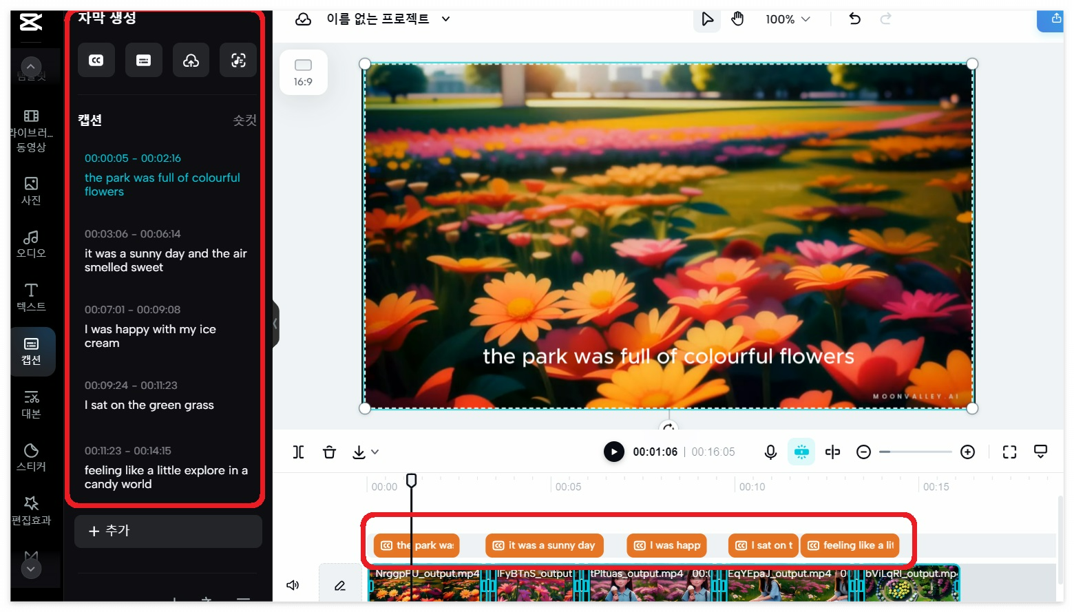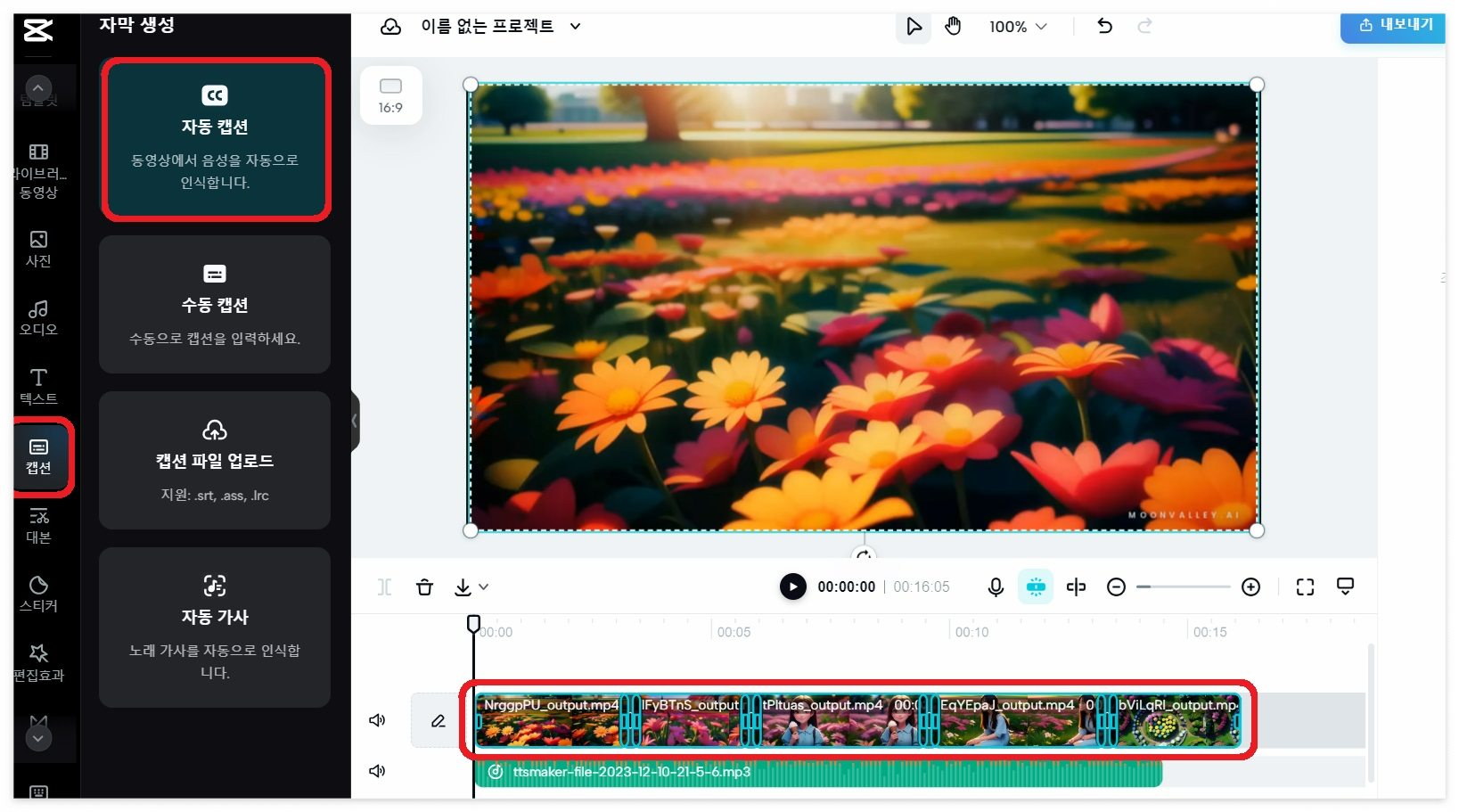 동영상 파일을 전부 선택하고 왼쪽 메뉴 캡션에서 자동 캡션을 누르면 음성을 자동으로 인식에서 해당 영상 위치에 자막으로 만들어줍니다.