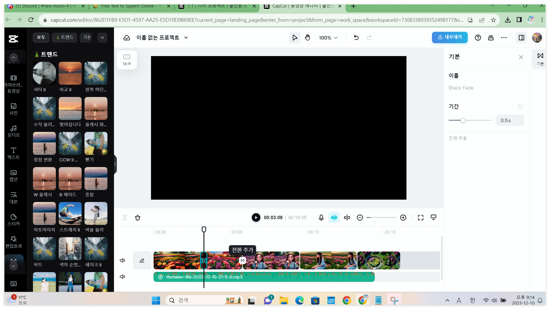 동영상 중간에 넘어가는 곳에 화면 전환의 효과를 줍니다. 또한 배경음악도 추가할 수 있습니다.