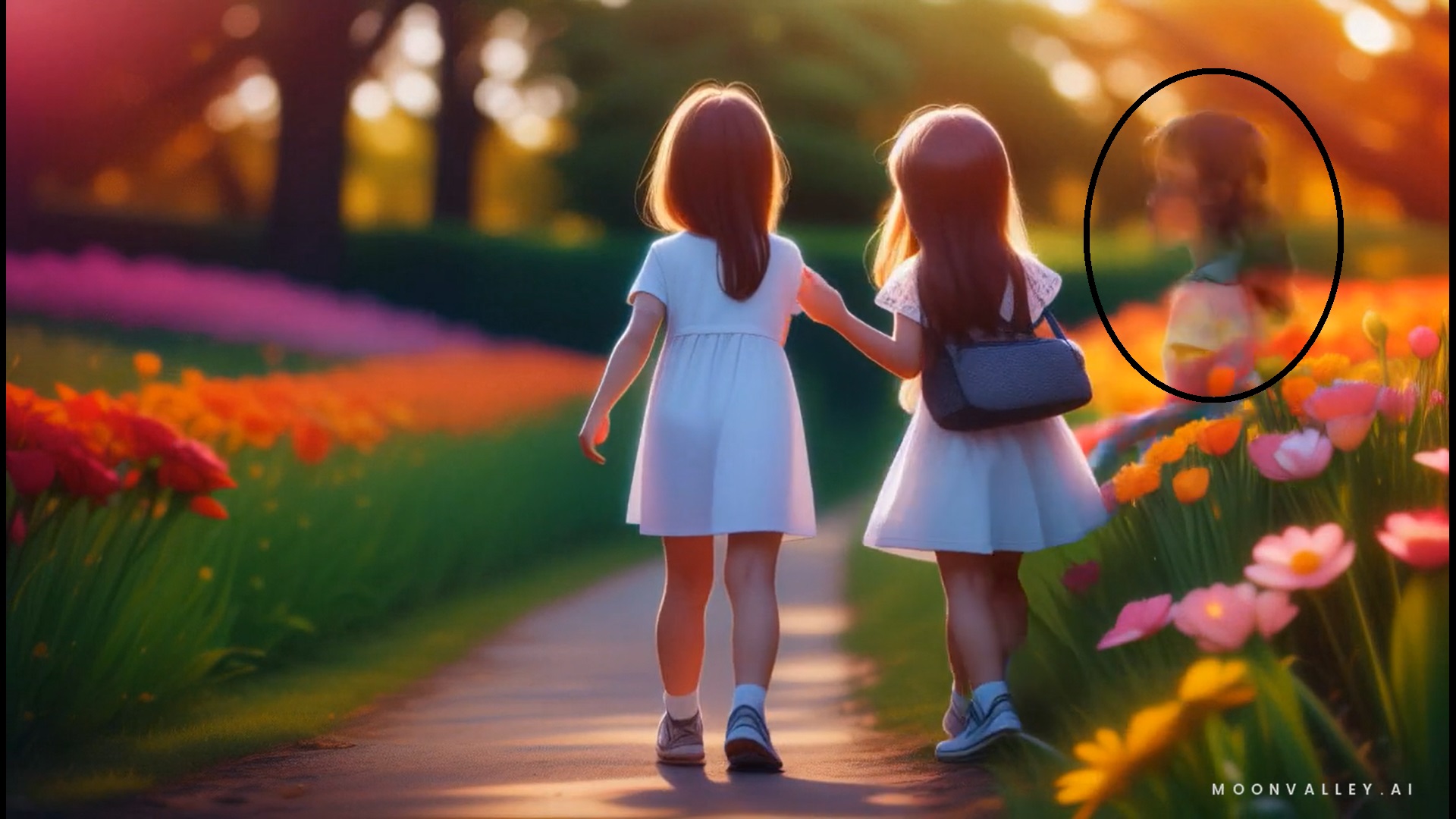 주위의 아름다운 꽃들과 함께 어린이들이 놀고 있는 모습을 보여줌