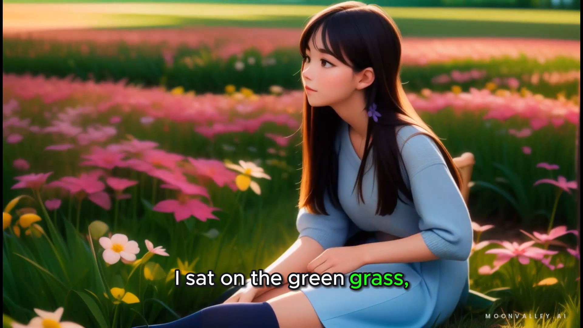 Illustrate the protagonist sitting on the green grass, feeling like a little explorer.