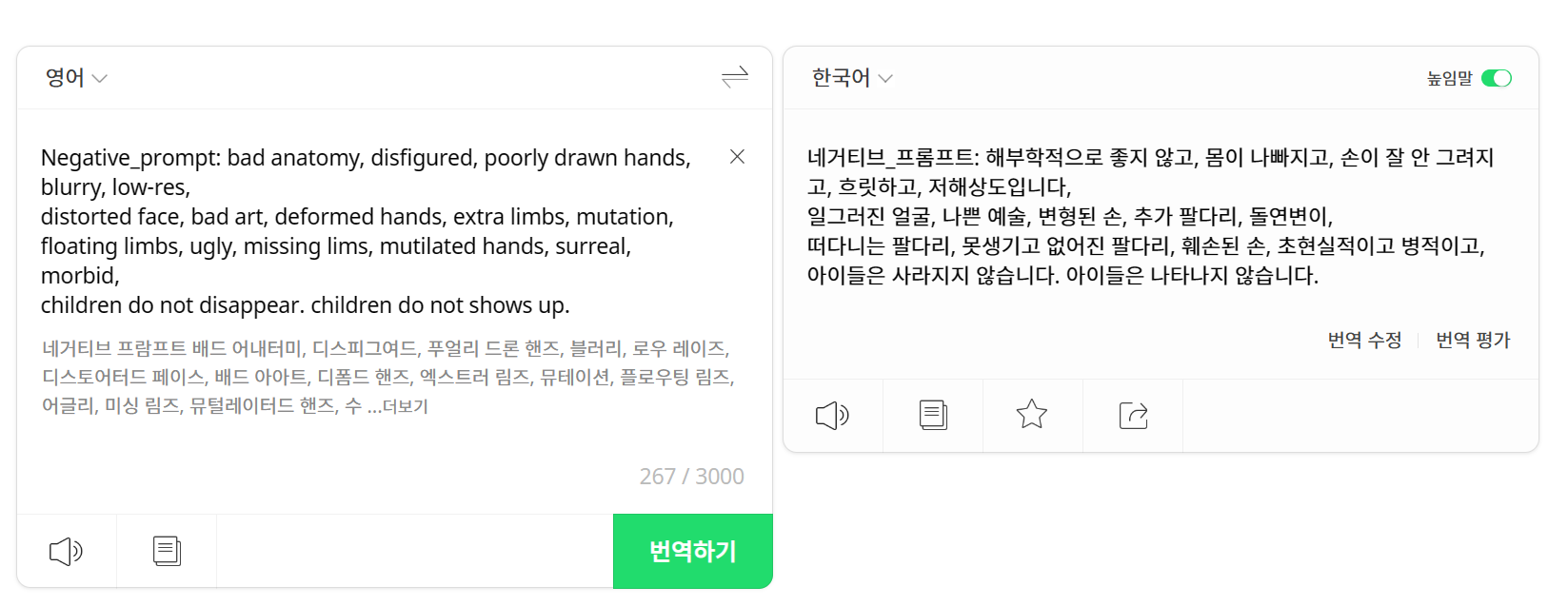 그리고 holding, playing은 단어들은 애니메이션이 깨질 경우가 많습니다. 네거티브 프롬프트를 통해 이를 잡아줘야 합니다. 아래 네거티브 프롬프트를 참고하세요.