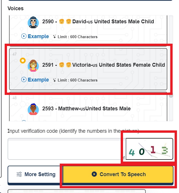 성우를 고른 뒤 숫자 코드를 쓰고 Convert To Speech를 해주시면 됩니다.