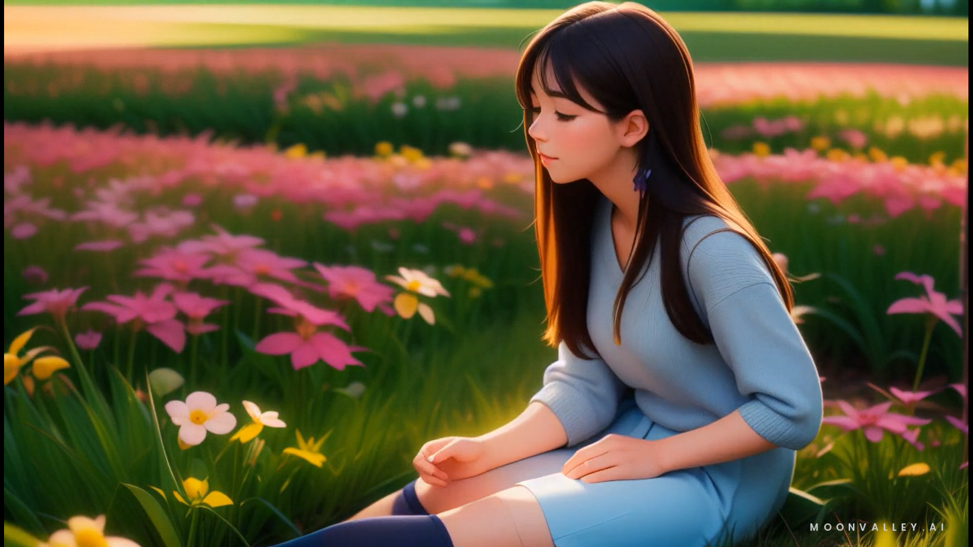 예) Illustrate the protagonist sitting on the green grass, feeling like a little explorer. -> Illustrate the karen sitting on the green grass, karen has long brown straight hair, looking at many the flowers.
