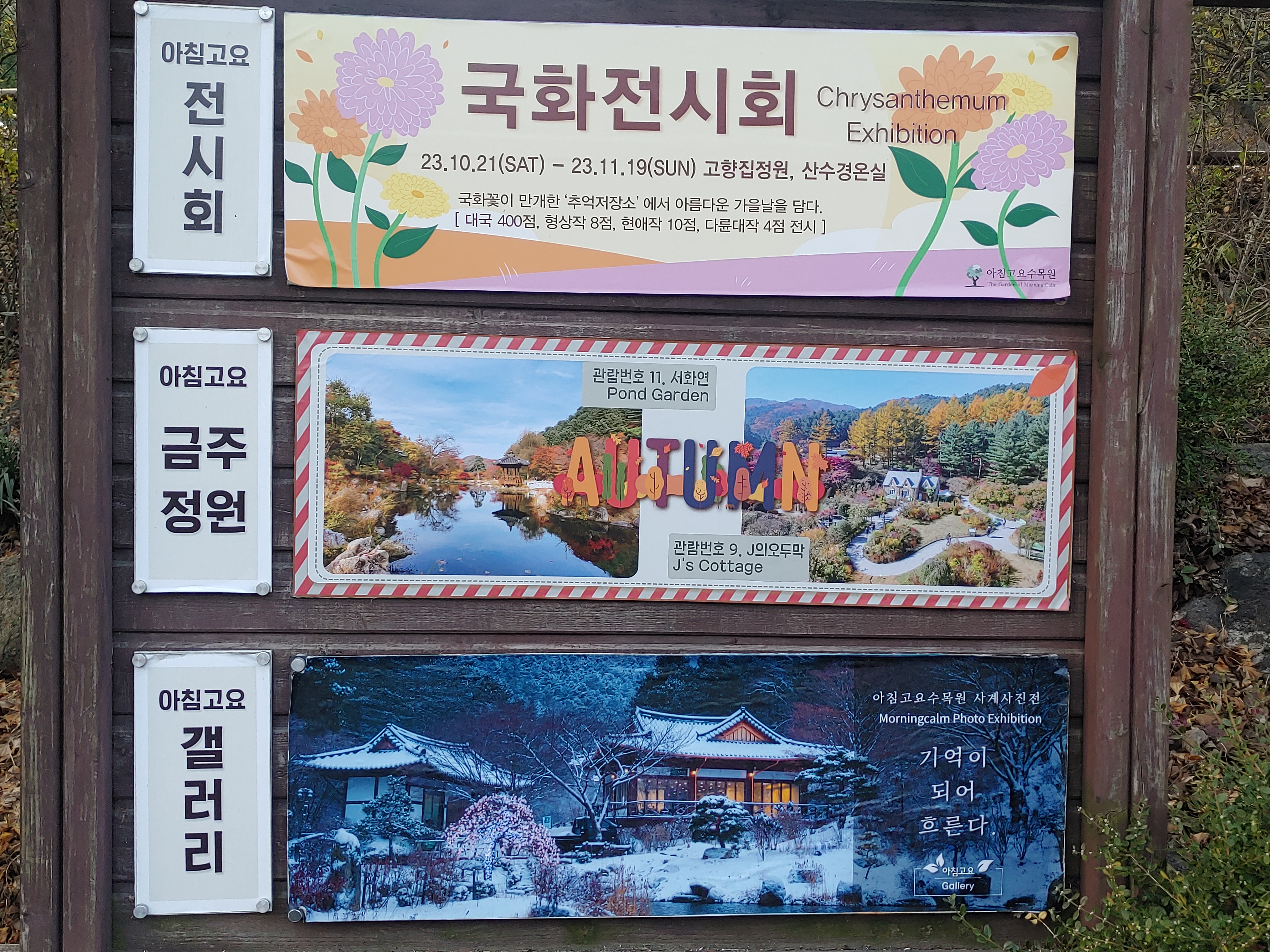 입구 쪽 근처에서는 국화 전시회와 그동안의 아침고요수목원의 역사에 대해서 전시가 되어 있었습니다. 1993년도에 시작해 지금까지 이여저 오고 있습니다.