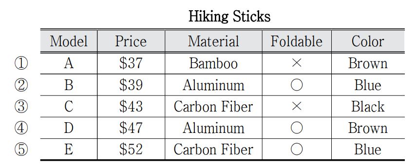 10. 다음 표를 보면서 대화를 듣고, 남자가 구매할 하이킹 스틱을 고르시오.