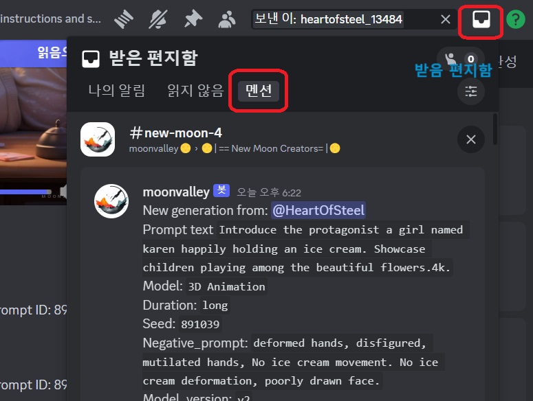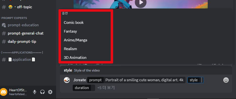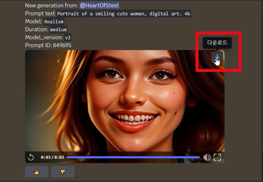 Moonvalley.ai 디스코드에서는 실시간으로 다른 사람의 영상을 보고 다운로드하고, 어떻게 프롬프트를 줬는지 확인 가능합니다. Discord로 이동해서 계정을 만드세요. 저도 디스코드를 좋아하진 않았지만, Moonvalley AI를 사용하다 보니 좋은 점이 상당히 많습니다.