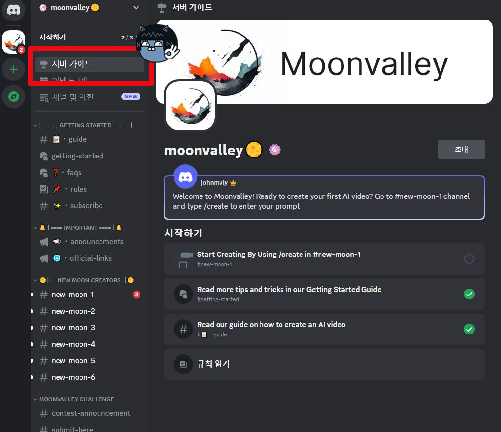 어느 정도 디스코드 단계를 거치고 Moovalley 크리에이터 채널을 찾습니다. 아래 그림 시작하기 밑 서버 가이드는 튜토리얼 및 안내사항이 있는데 추후에 차분히 읽어보시면 도움이 많이 됩니다.