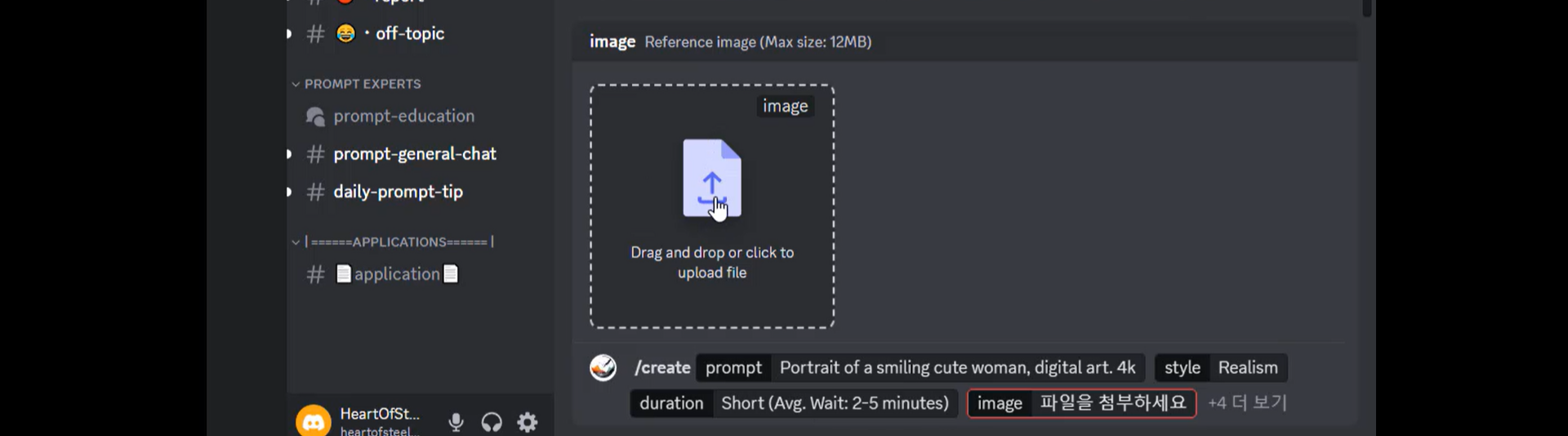 'prompt'에서는 어떤 동작이라든가 원하는 장면을 입력합니다. 4k 화질로 웃고 있는 여성의 얼굴 모습을 사실적으로 만들고 싶다고 하면  '웃고 있는 귀여운 여성의 초상화, 디지털 아트, 4k로' 정도로 생각하고 영어로 바꿔서 , 'Portrait of a smiling cute woman, digital art. 4k.'로 입력합니다. 프롬프트 지시 사항은 간단명료한 게 좋아 보이고요. 계속 다른 유저 프롬프트를 참고해서 자신만의 프롬프트를 만들어야 될 거 같습니다.