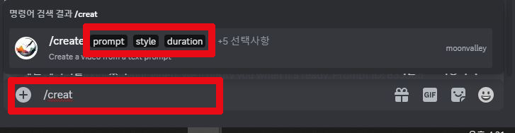 동영상을 만들기 위해서는 먼저 하단 채팅란에 /creat를 타이핑하고 핵심 설정 3가지를 입력하시면 됩니다.