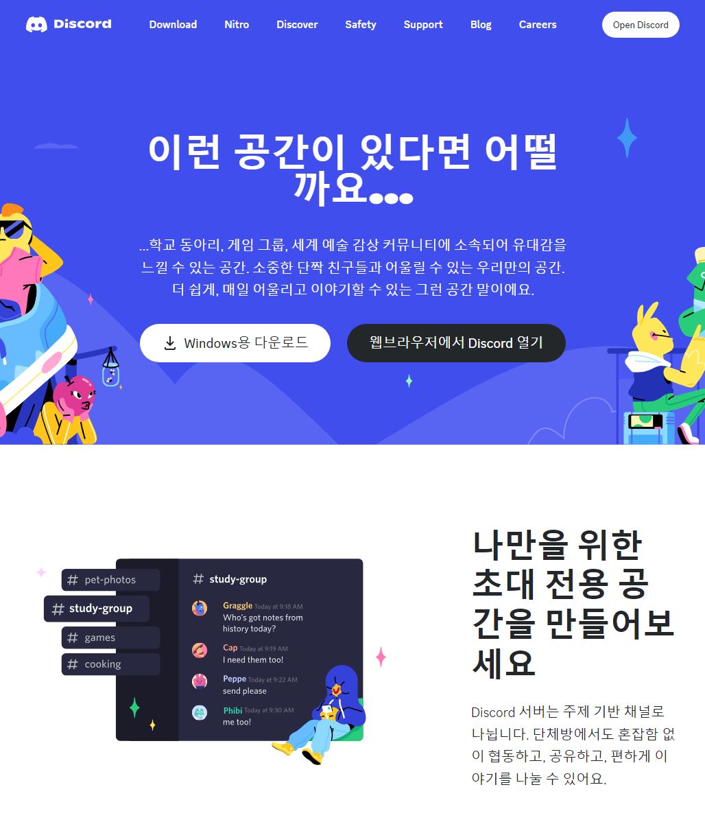 Discord: 게임에 많이 쓰이는 실시간 음성과 채팅 프로그램으로 그 안에서 다양한 소통이 가능합니다.